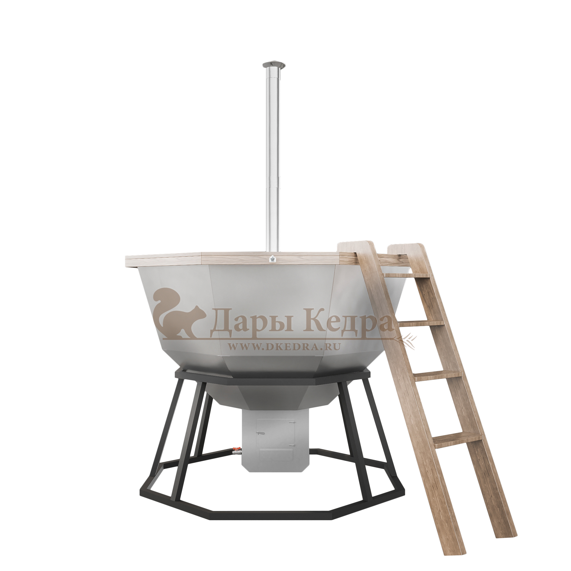 • Банный чан из нержавеющей стали Ø-2000 на подставке Банный чан на подставке изготовлен из пищевой стали. Представляет собой большую ёмкость в виде чаши, при нагревании которой можно париться на свежем воздухе. Чан установлен на устойчивую металлическую подставку и оборудован кедровым бортом, скамейками, подспинниками, трапом для ног и приставной лестницей. Нагревание банного чана происходит от обычного костра. Если оборудовать данную модель печью, то банные процедуры можно принимать даже зимой.