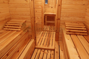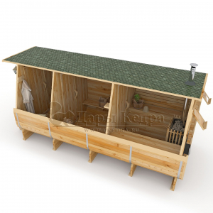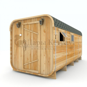 Это прямоугольное изделие с закругленными углами. За счет такой конструкции во время топки воздух циркулирует по кругу, поэтому баня-бочка нагревается не более 30 минут. Баня включает в себя раздевалку, моечную и парную. Во всех трех отделениях лавочки из кедра установлены с обеих сторон. Печь расположена в парилке около дальней стены. Для удобства пользования в бане висят полочки из кедра и вешалка в раздевалке. По вашему желанию баню-бочку квадро можно укомплектовать козырьком, верандой и печью с внешней загрузкой, благодаря которой весь мусор после топки остается на улице. Баня-бочка квадро не требует полноценный фундамент, поэтому при необходимости ее можно перенести в другое место.