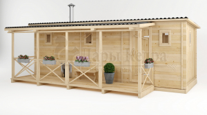 Это классическая прямоугольная модель бани с тремя отделениями: предбанником, моечной и парилкой. Для удобства пользования предбанник оснащен лавочкой и вешалкой. В моечной находится лавка и полочка из кедра. Парилка оборудована двухуровневым открытым полком и печью. Время растопки такой бани не превышает 30 минут. На просторной веранде можно оставить вещи или отдохнуть после парения. Каркасно-щитовую баню можно заказать как в готовом, так и в разборном варианте. В разборной модели готовые щиты из кедра быстро собираются в полноценное строение, что также позволяет исключить лишний строительный мусор. Такая баня не требует полноценный фундамент, поэтому при необходимости ее можно перенести в другое место.