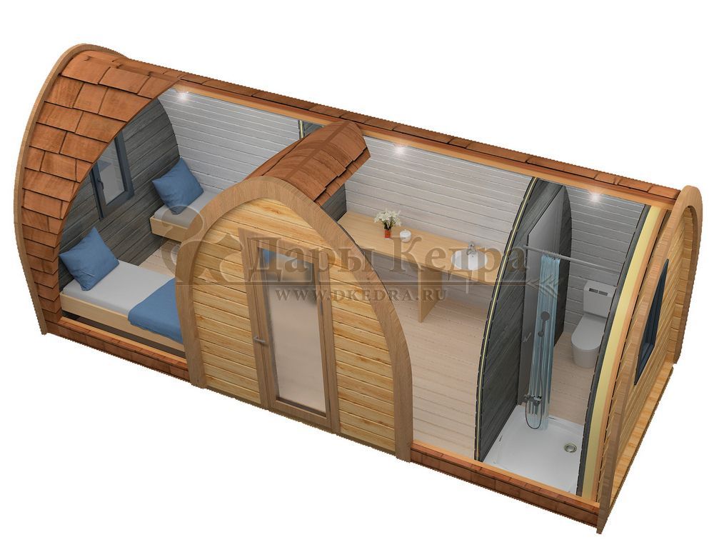 Такой кемпинг дом удобное и практичное решение для дачного использования или обустройства загородных баз отдыха. Увеличенные размеры и боковой вход со стеклянной дверью позволяют зонировать внутреннее пространство помещения. Домик включает в себя: