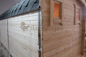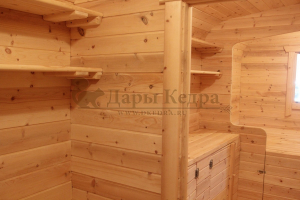 Домик с тремя помещениями подходит для дачного использования в теплое время года или обустройства загородных баз отдыха. Прихожая и кухня занимают одну комнату, в которой стоит стол из кедра. Две другие оборудованы четырьмя деревянными лежаками, по желанию их можно заменить на двуспальные кровати. Либо обустроить санузлом и душевой зоной. Для удобства пользования кемпинг дом можно укомплектовать верандой с лавочками или козырьком.